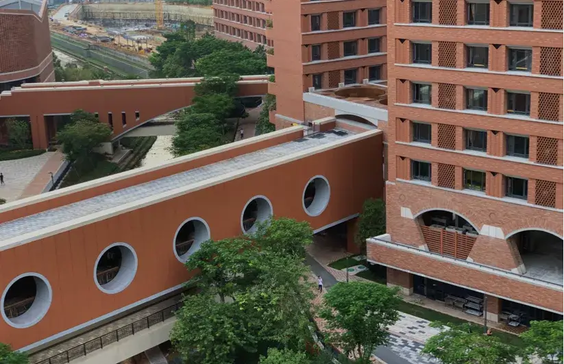 深圳中學(泥崗校區)按照“一心兩軸三區”的規劃,將校園分為教學區、運動區及生活區。教學區共有4棟教學樓,采用U字形圍合布局,內、外廊相結合,單體建筑之間相互連通,打造了一個無障礙的活動空間。
